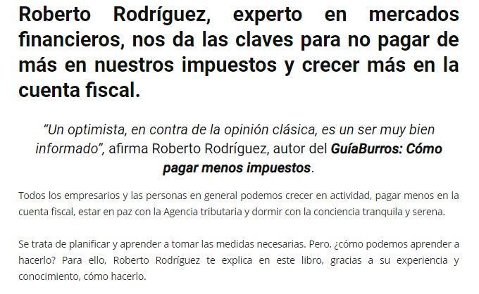 El medio escrito Mundo Emprende, cuyo programa radiofónico es el programa líder en emprendimiento en España con más de 130.000 oyentes, según el EGM 2019, ha hecho una reseña del «GuíaBurros: Cómo pagar menos impuestos», de Roberto Rodríguez, una guía con todo lo que debes saber para no pagar de más, desde la justificación de la optimización fiscal en la empresa, pasando por la fiscalidad bonificada en los sistemas retributivos, hasta las posibilidades para autónomos y pequeños empresarios.